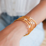 The interior of the bracelets is crafted from 22K gold leaf. The mantra is made of silver with gold plating, and the bracelets are coated to be waterproof. They are lightweight, make no noise, and can be worn during any activity.