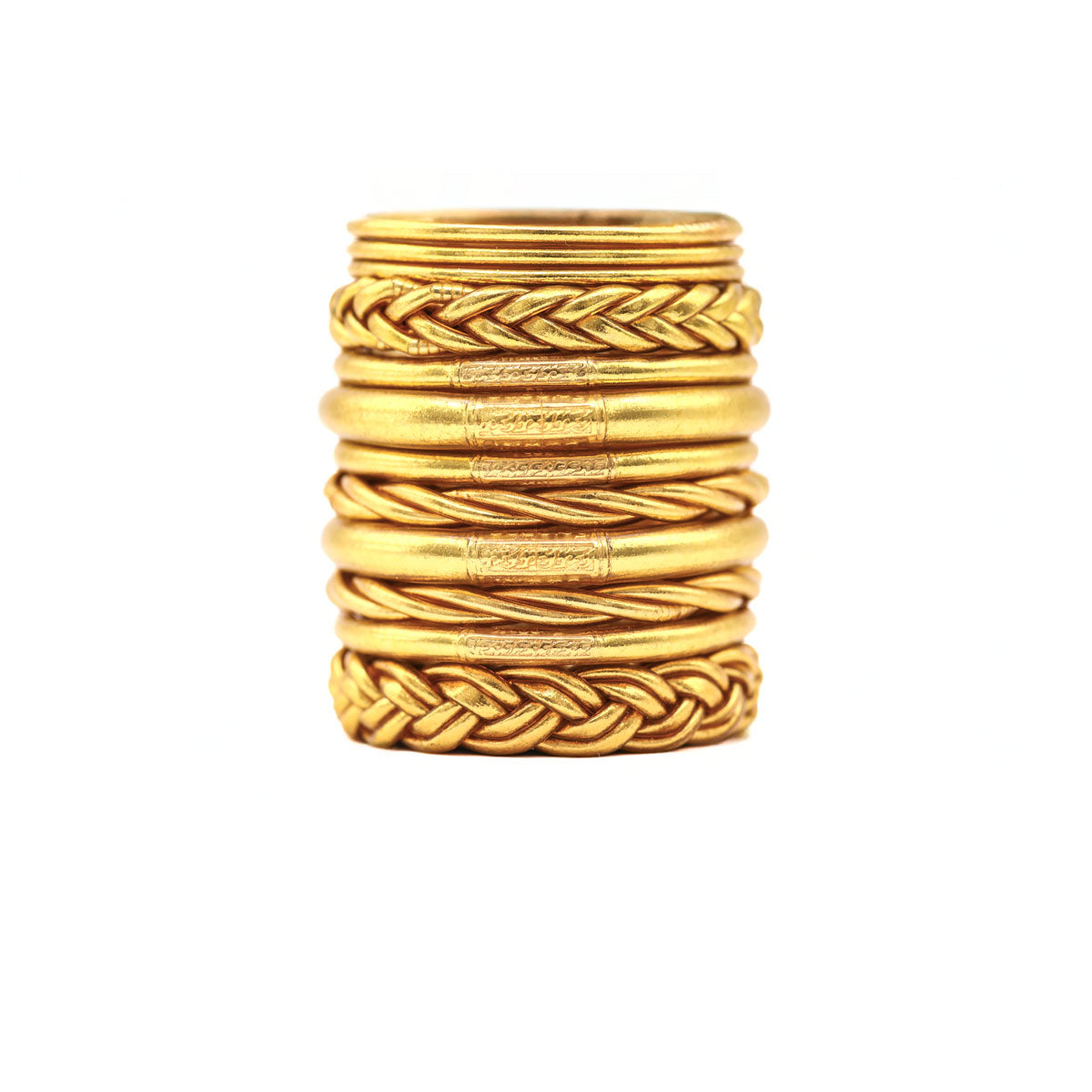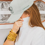The interior of the bracelets is crafted from 22K gold leaf. The mantra is made of silver with gold plating, and the bracelets are coated to be waterproof. They are lightweight, make no noise, and can be worn during any activity.
