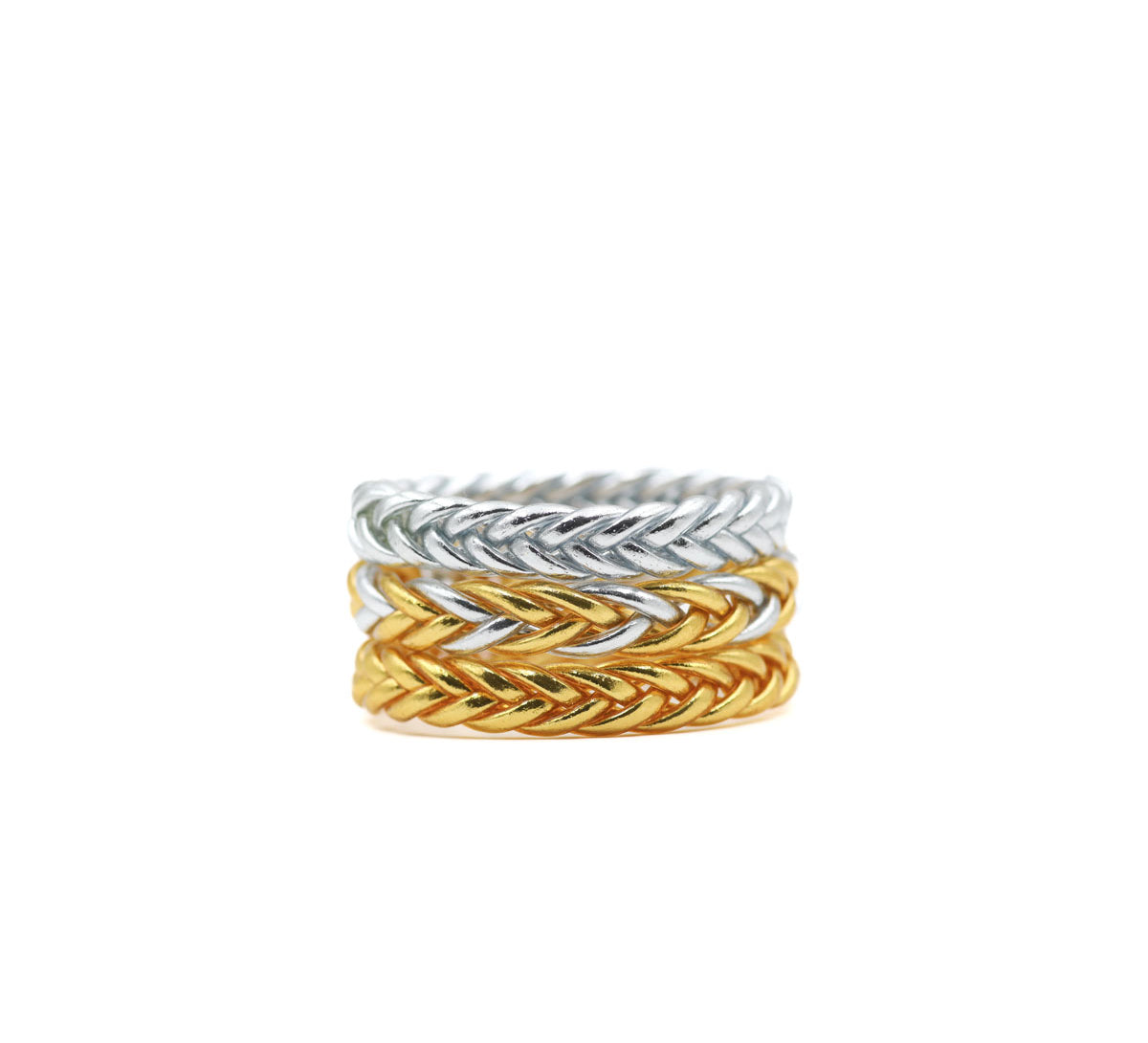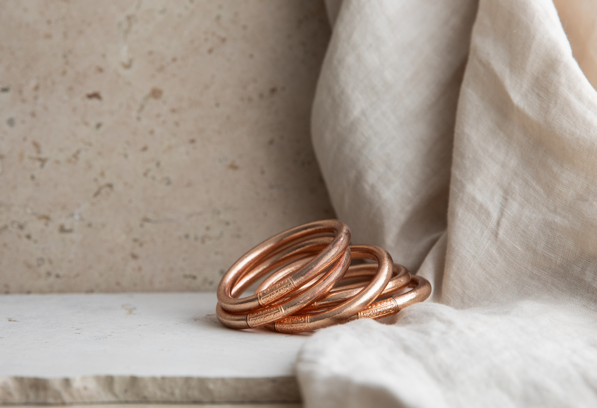 The interior of the bracelets is crafted from 22K gold leaf. The mantra is made of silver with gold plating, and the bracelets are coated to be waterproof. They are lightweight, make no noise, and can be worn during any activity.